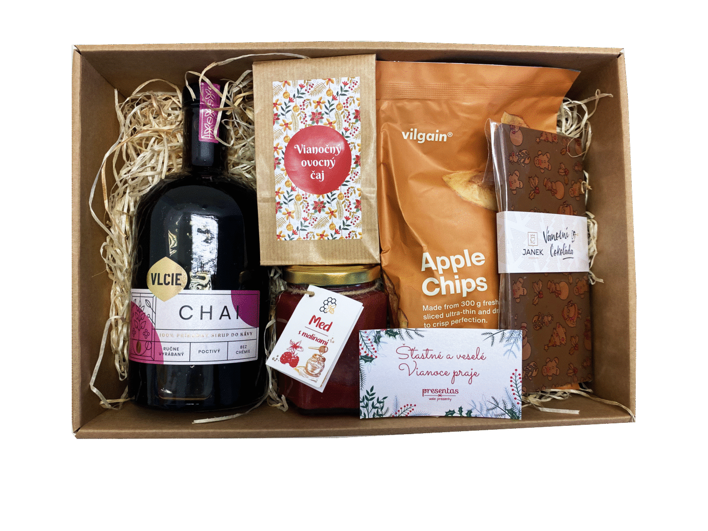 Balíček Chuť Vianoc obsahuje: vianočný čaj (50g, rôzne druhy), jablčné chipsy (30g, rôzne druhy), ochutený med (225g, rôzne druhy), sirup do kávy (500ml, rôzne druhy), tabuľková vianočná čokoláda (85g). Balenie: na výber z dvoch balení. Vianočná papierová taška / darčeková krabica (rozmer: 21x31cm), rafia. V cene je aj kartička s venovaním vo vlastnom dizajne vo vizitkovom formáte.