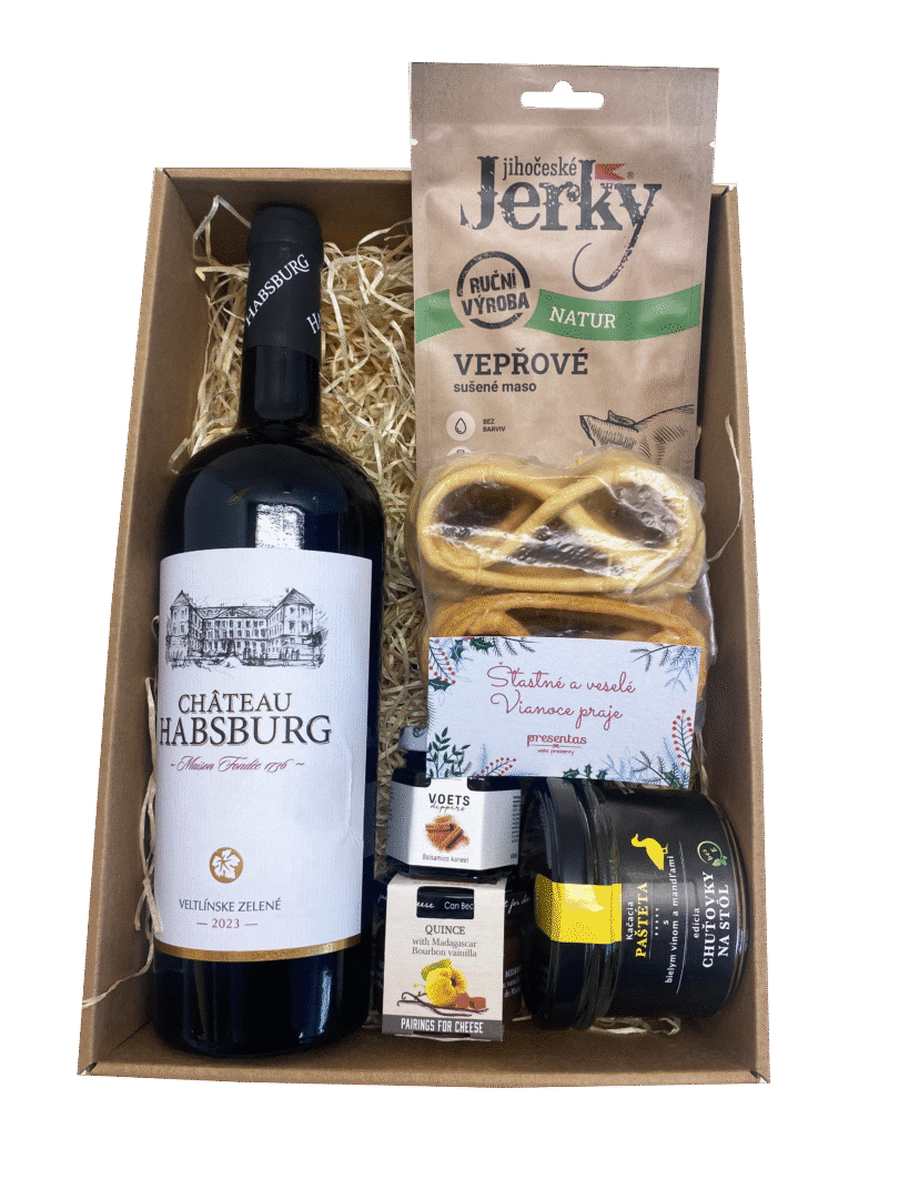 Balíček Delikates obsahuje: Veltlínske zelené 2023 (0,75l), dip (45ml, rôzne druhy), konfit (66-70ml, rôzne druhy), chuťovka na stôl (120g, rôzne druhy), balíček domácich praclíkov (15ks, rôzne druhy), jerky (20g, rôzne druhy). Balenie: na výber z dvoch balení. Vianočná papierová taška / darčeková krabica (rozmer 27x41cm), rafia. V cene je kartička s venovaním vo vlastnom dizajne vo vizitkovom formáte.