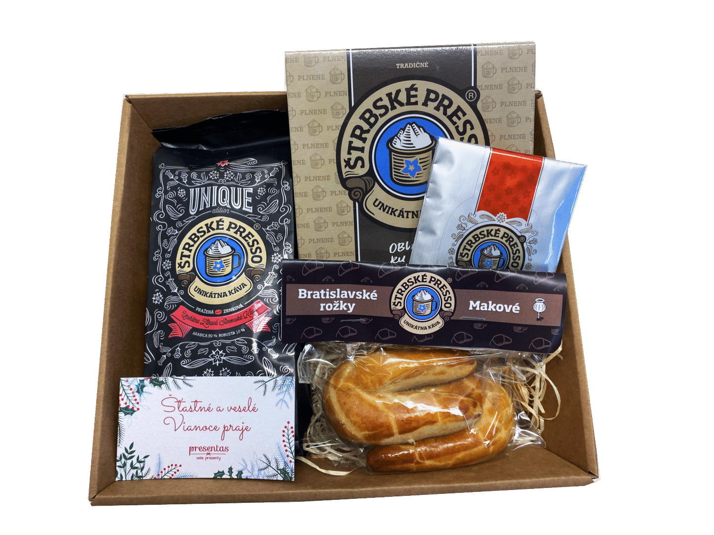 Balíček Kávičkár obsahuje: zrnková káva Štrbské presso unique red (250g), tradičné oblátky (30g), bratislavské rožky (2ks, rôzne druhy), zmes korenia ku káve (20g, rôzne druhy). Balenie: na výber z dvoch balení. Vianočná papierová taška / darčeková krabica (rozmer 25x22cm), rafia. V cene je aj kartička s venovaním vo vlastnom dizajne vo vizitkovom formáte