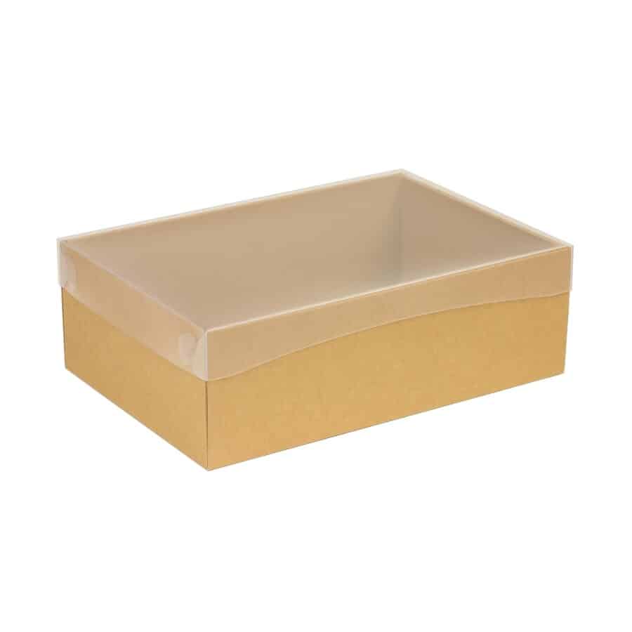 Darčeková krabica s priehľadným vekom a s rafiovou výplňou vo veľkosti 300x200x100/35 mm, hnedá – kraft. V balení aj kartička s venovaním vo vlastnom dizajne vo vizitkovom formáte.