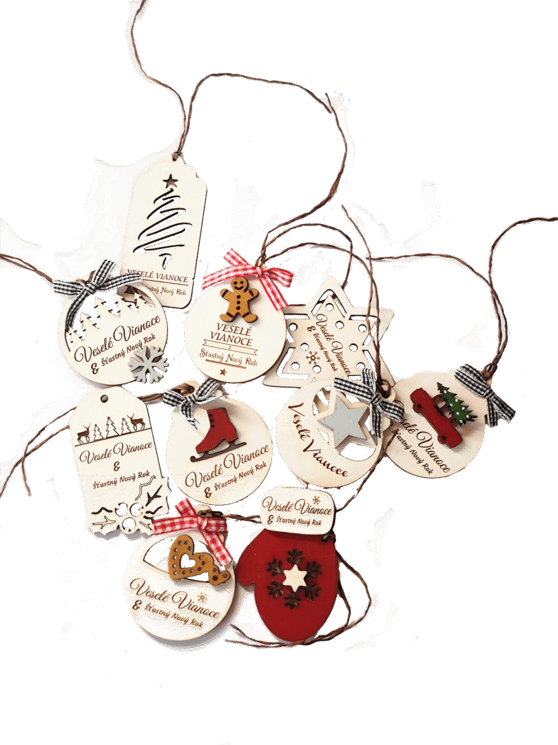 Ručne vyrábané drevené ozdoby rôznych tvarov. Využitie ako vianočná ozdoba alebo originálna drevená visačka. Rôzne vzory. (Priemer: 5,5cm). Vyrobené na Slovensku. Možnosť vygravírovať vlastný text alebo logo.